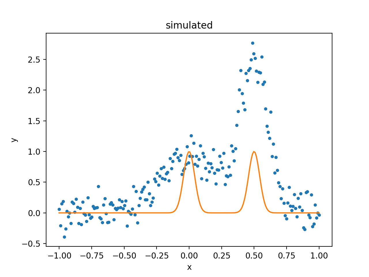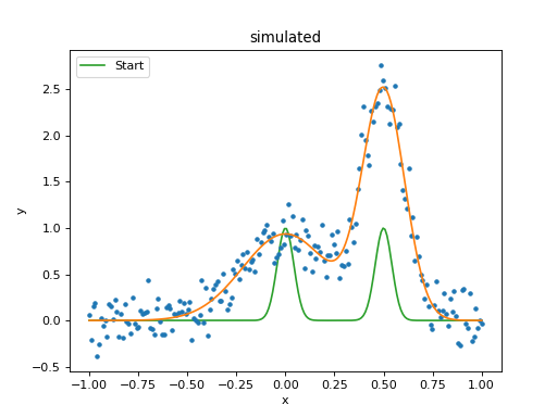 The following example fits two one-dimensional gaussians to a simulated dataset. It is based on the AstroPy modelling documentation, but has linked the positions of the two gaussians during the fit.
