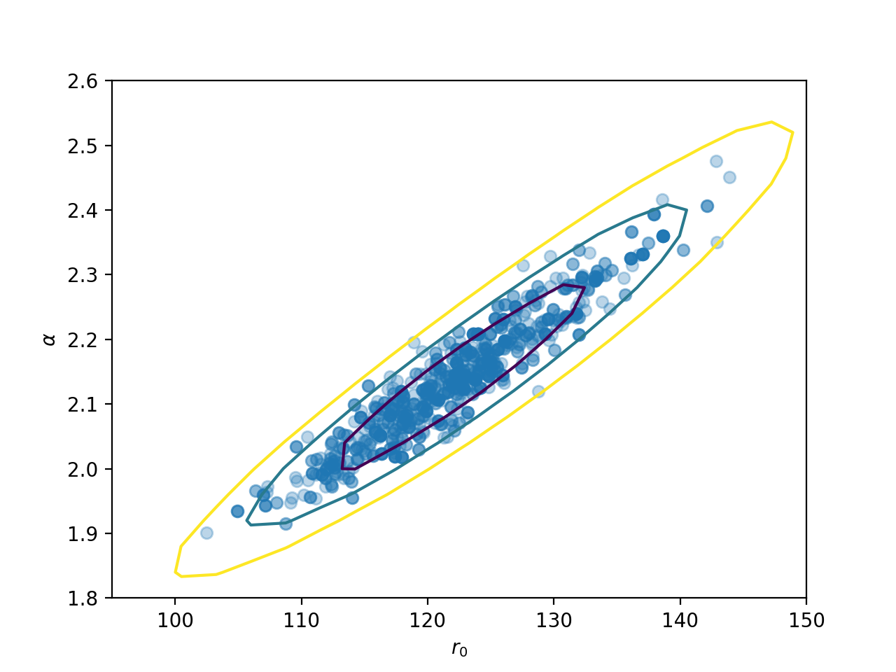 >>> rproj.prepare(min=[95, 1.8], max=[150, 2.6], nloop=[21, 21])